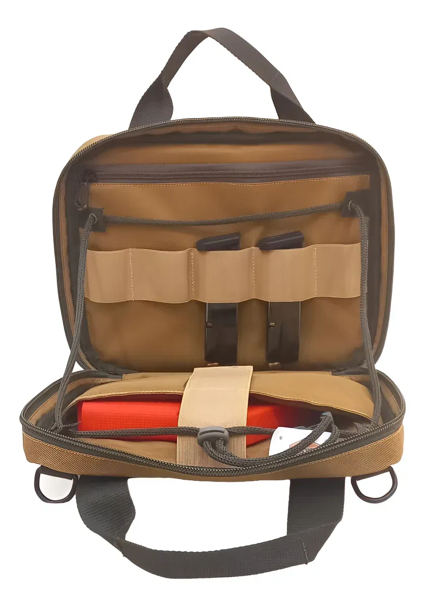 Este bolso de estilo maletín cuenta con un bolsillo interno para documentación o accesorios con cierre y otro bolsillo para el arma con cierre elástico.
