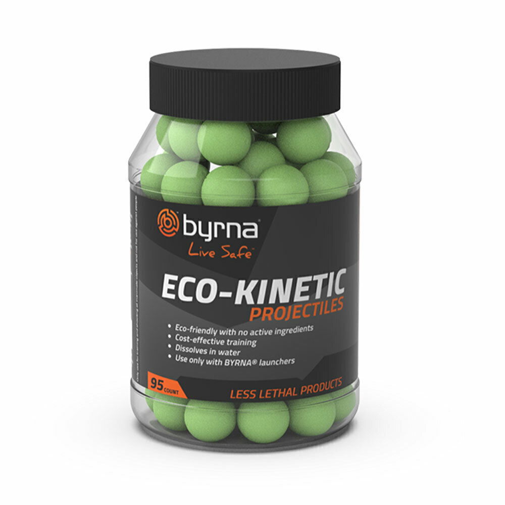 Los proyectiles Eco-Kinetic también incorporan la tecnología VI (Impacto Visual) patentada por Byrna, que produce una pequeña nube de dispersión y deja una marca muy visible en el lugar donde se alcanza el blanco.