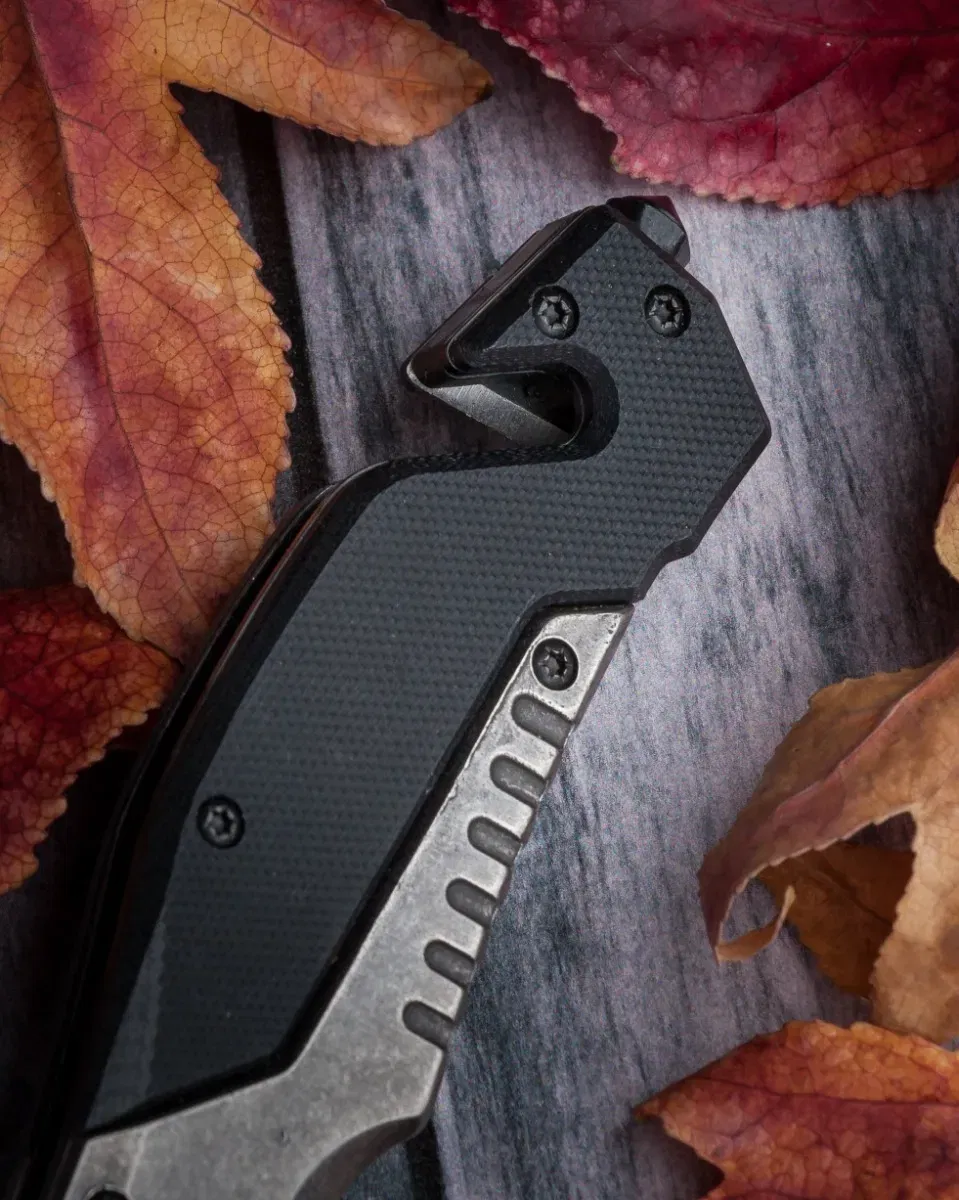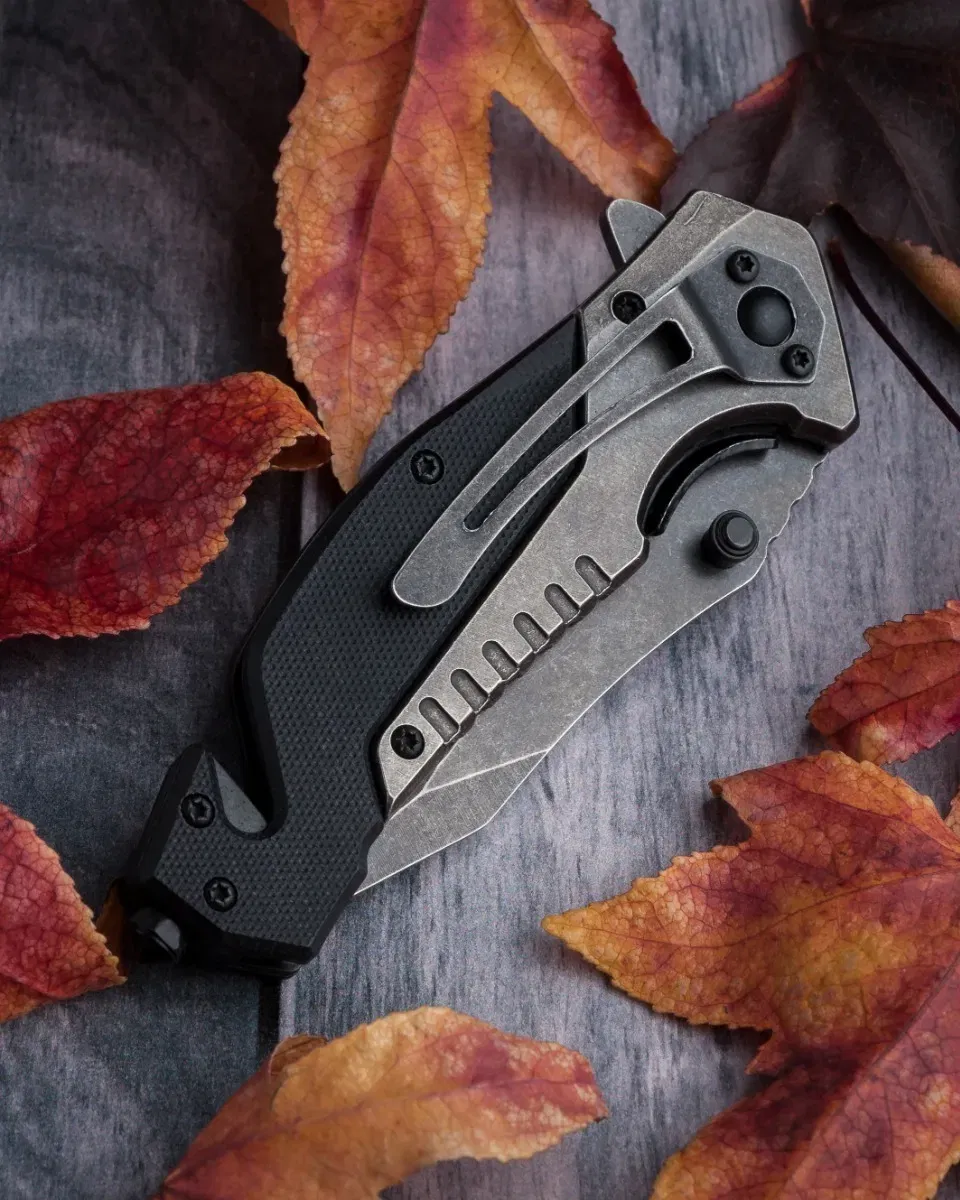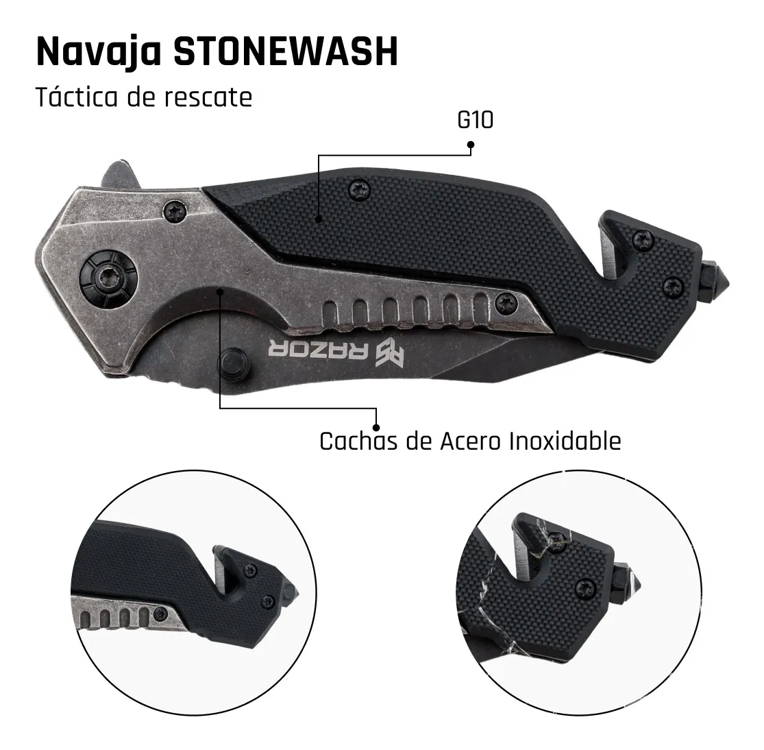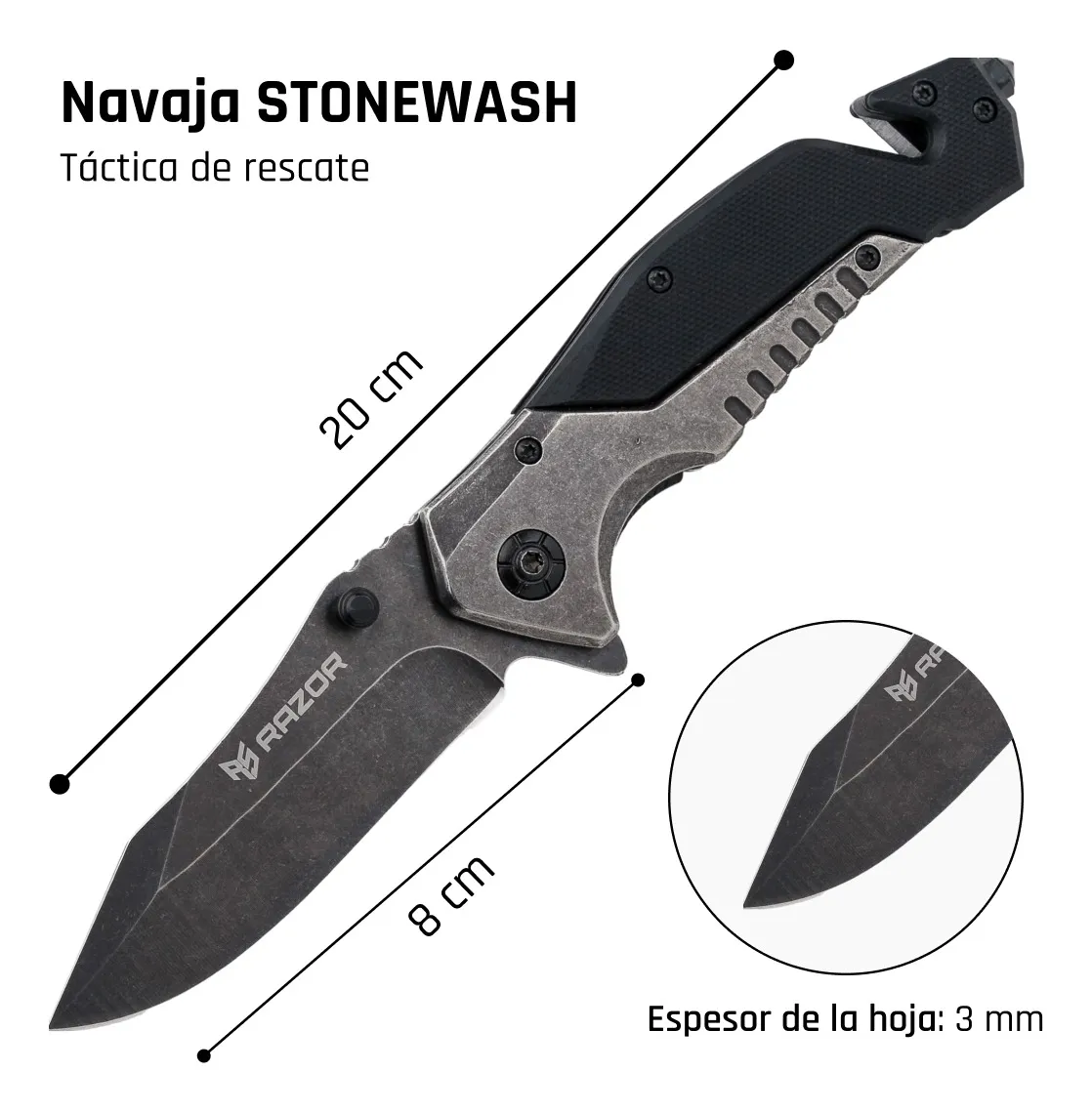 NAVAJA TACTICA DE RESCATE GRIS ACABADO DESGASTADO ANTIGUO STONEWASH CON ROMPEVIDRIO Y CORTACINTURON
