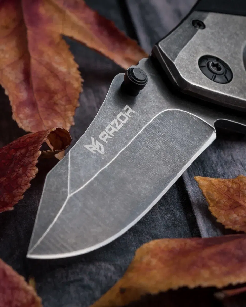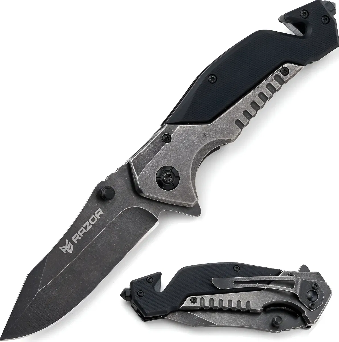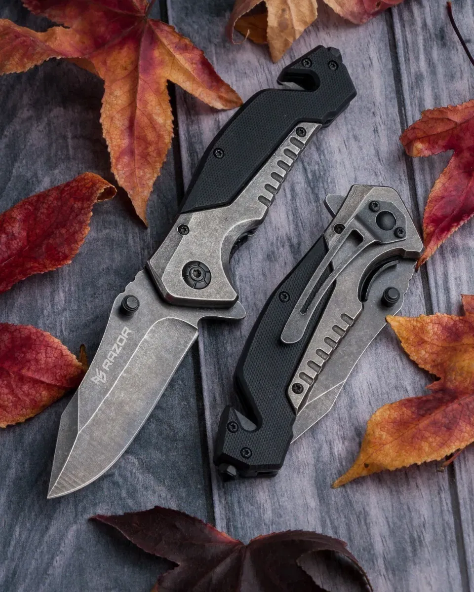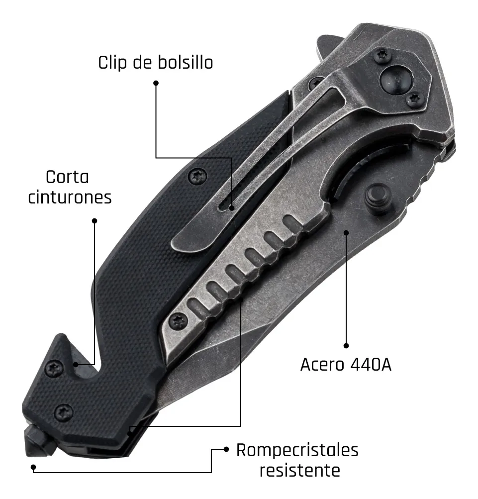 NAVAJA TACTICA DE RESCATE GRIS ACABADO DESGASTADO ANTIGUO STONEWASH CON ROMPEVIDRIO Y CORTACINTURON