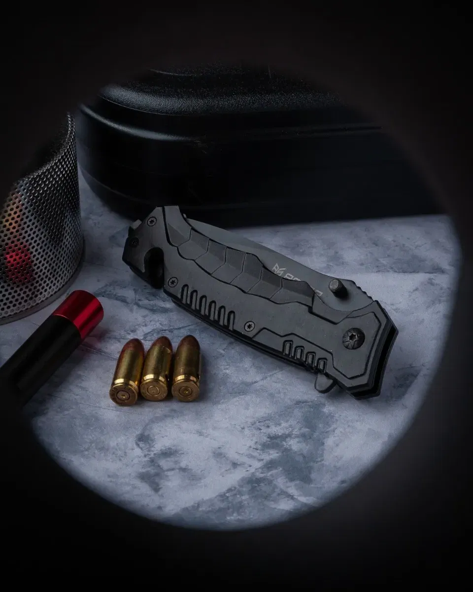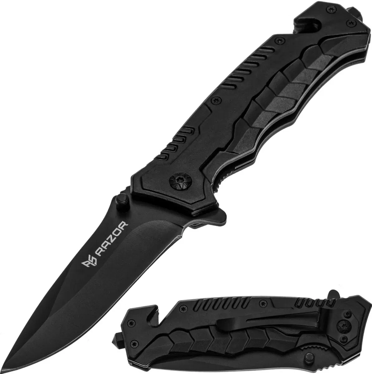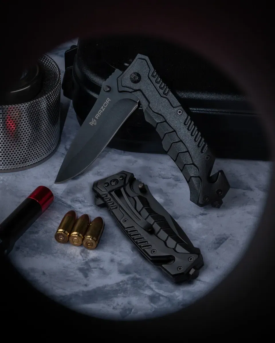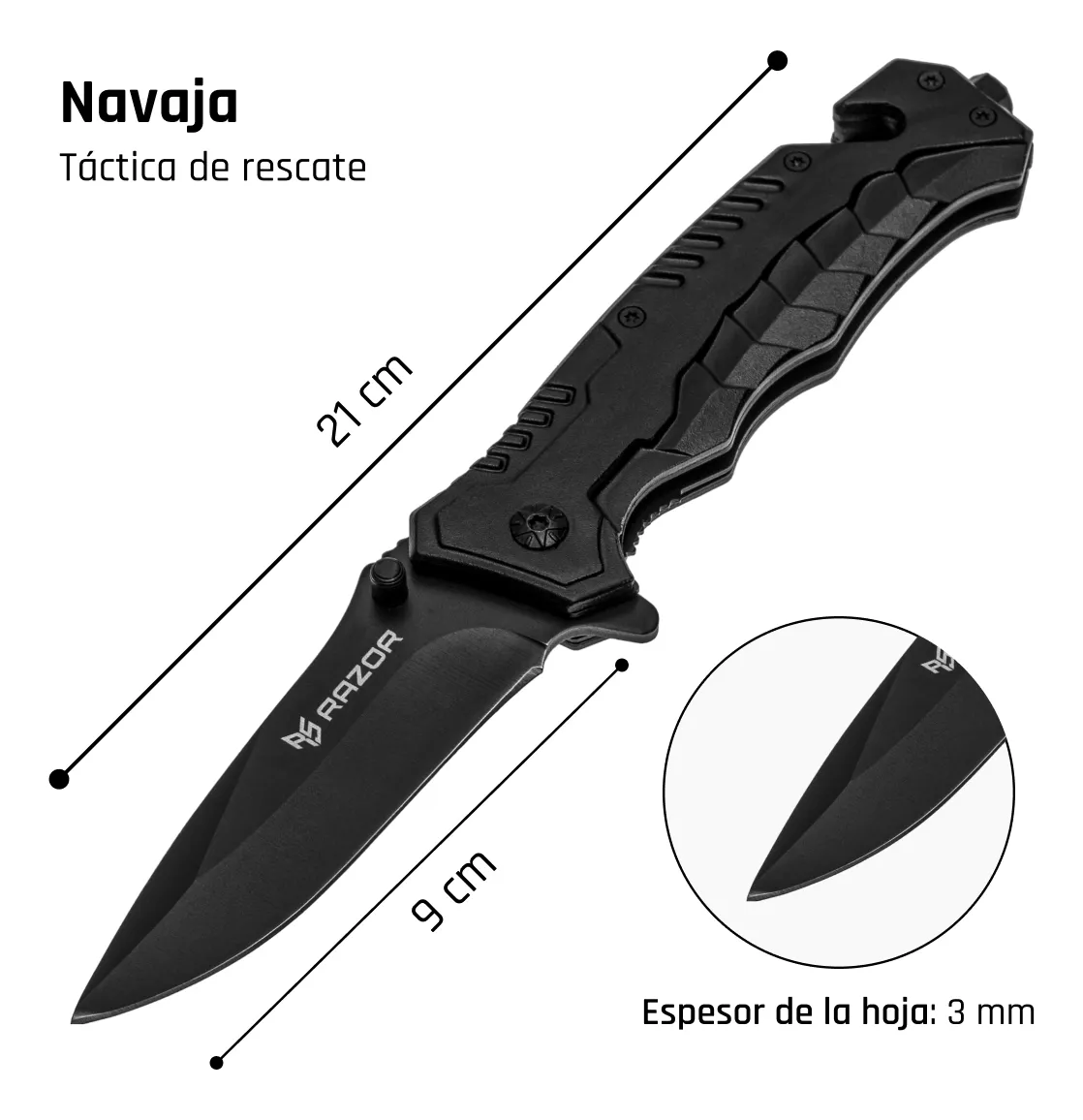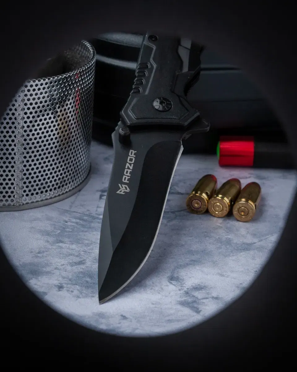 Hermosa navaja RAZOR negra construida enteramente en acero inoxidable, super portátil y fácil de llevar con su clip para el bolsillo o cinturón.