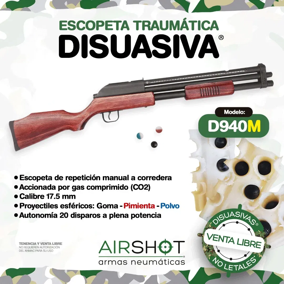 La DISUASIVA D940M es accionada por gas comprimido (CO2) y dispara proyectiles (20) redondos de calibre 17.50 mm y proyectiles químicos irritantes que pueden incapacitar a una amenaza desde una distancia de hasta 30 metros, sin necesidad de estar cerca del agresor. Es fácil de usar, seguro y confiable.