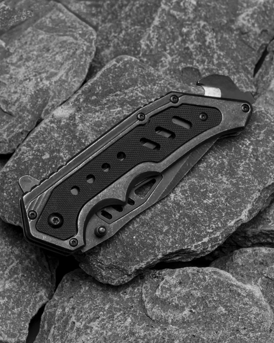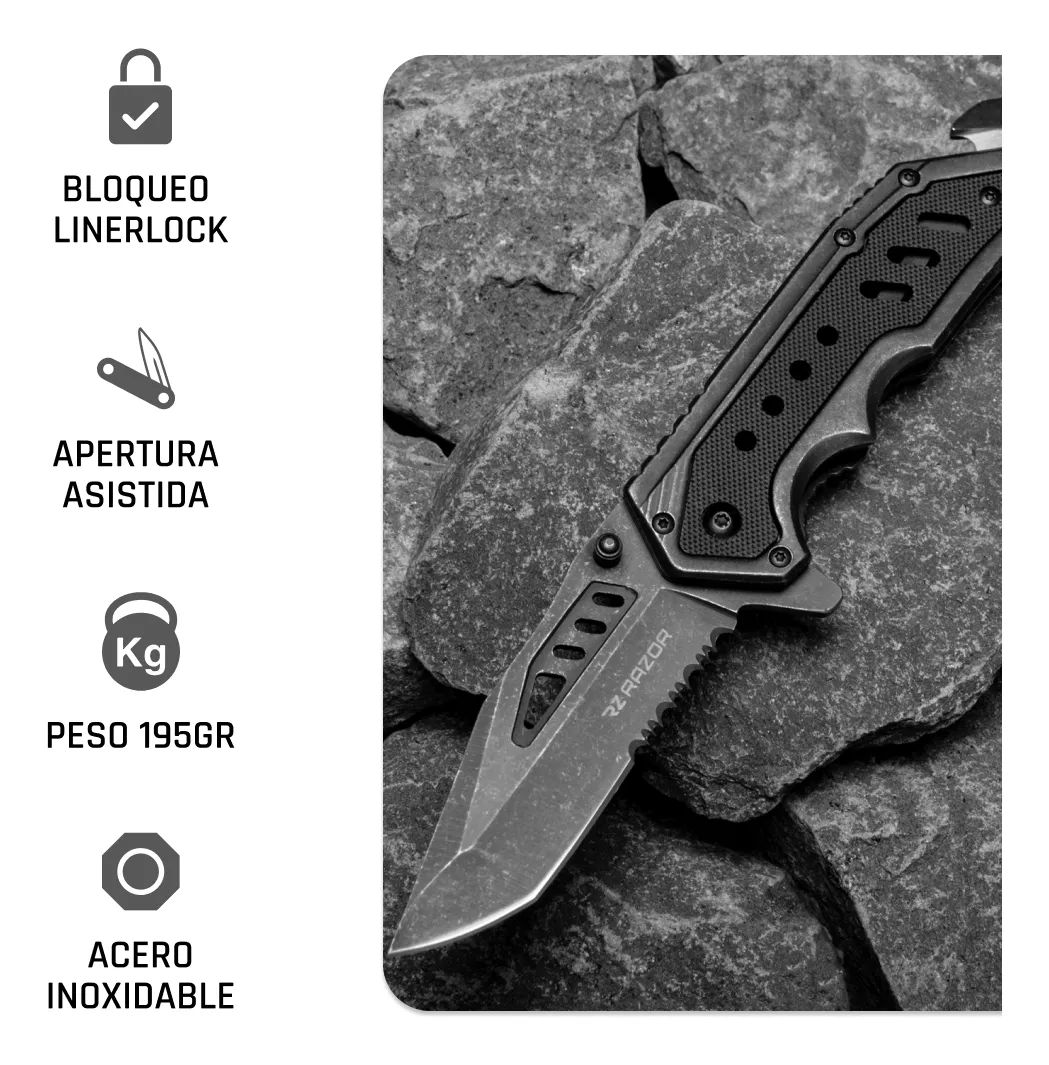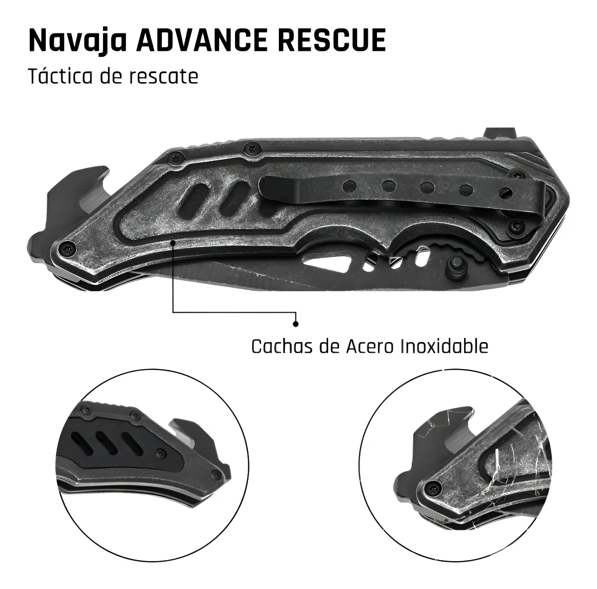 NAVAJA TACTICA DE RESCATE GRIS ACABADO DESGASTADO ANTIGUO ADVANCE RESCUE CON ROMPEVIDRIO Y CORTACINTURON
