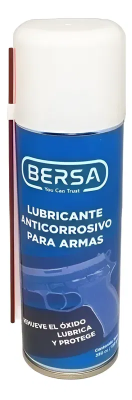 El nuevo LUBRICANTE BERSA ANTICORROSIVO PARA ARMAS esta compuesto de una equilibrada combinación de productos orgánicos y metálicos que brindan positiva acción protectora, antioxidante y lubricante, junto con cualidades de muy baja viscosidad, antidesgaste y antifricción. Fue especialmente desarrollado para la lubriprotección de los mecanismos y el cañón de armas largas y cortas. Su fluido penetrante, se introduce en partes de difícil acceso removiendo posible formación de óxido y su película protectora resiste la acción de agentes corrosivos como: humedad, agua, salitre, etc. El Lubricante Bersa Anticorrosivo para armas, es un excelente protector en almacenaje de armas.