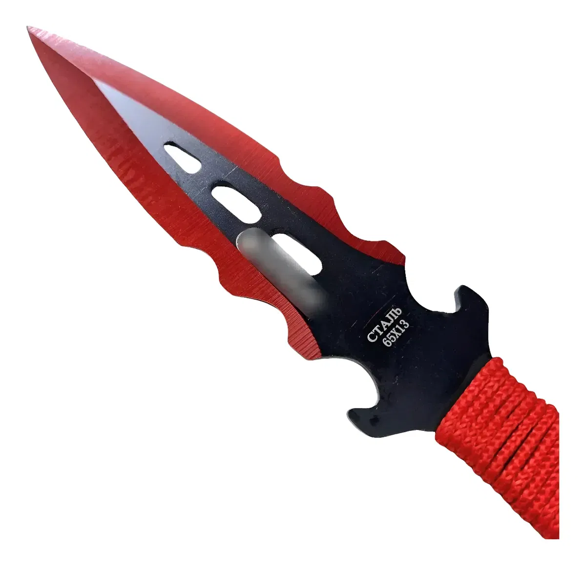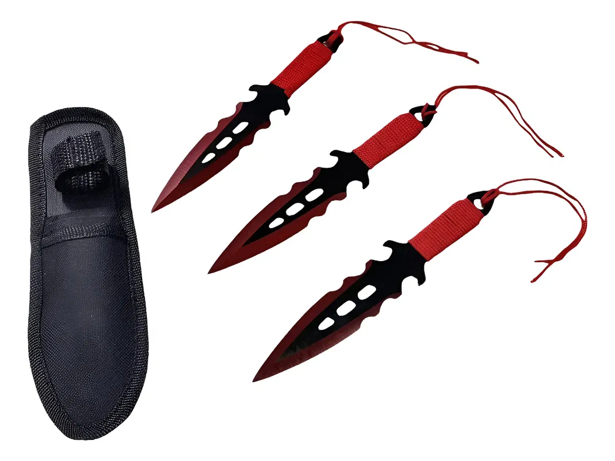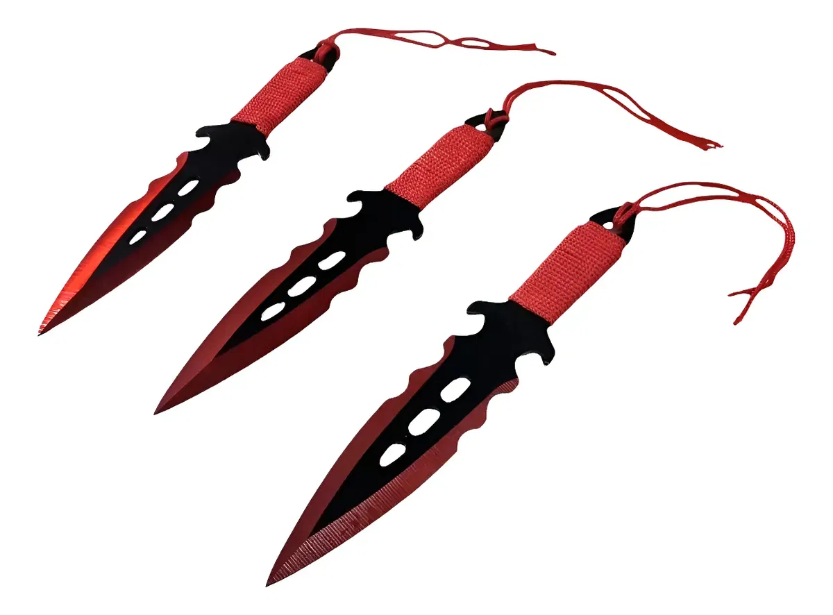 Set x 3 Cuchillos lanzadores Daga / KunaiDetalles en rojo (En su doble filo)Incluye Funda de poliéster con ojal para cinturónEmpuñadura revestida por cordón rojo(Imágenes del producto con carácter ilustrativo)