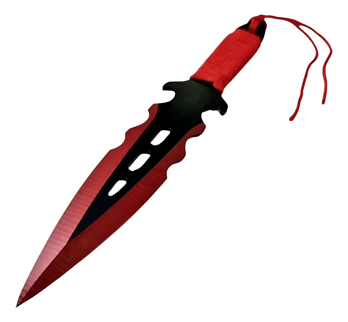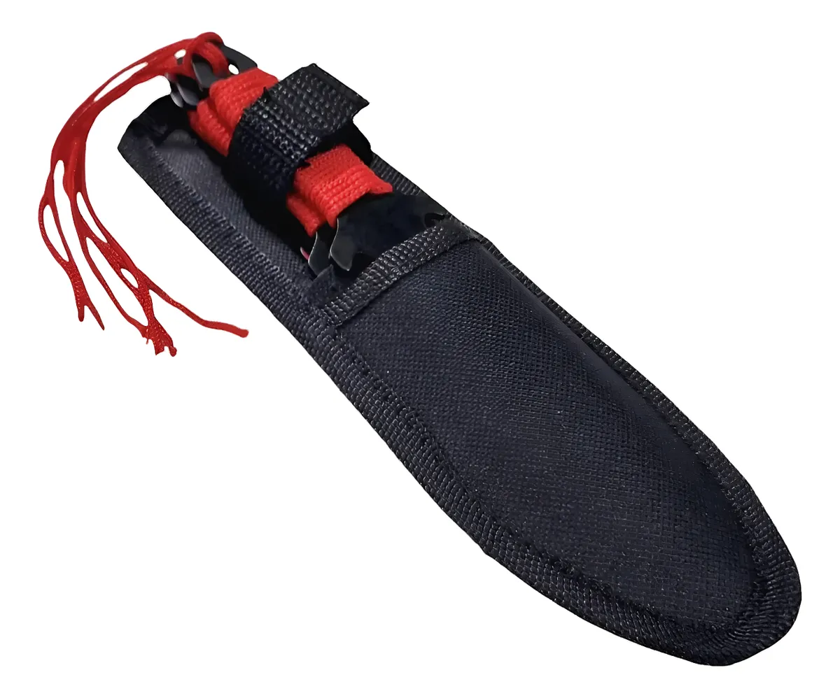 Set x 3 Cuchillos lanzadores Daga / KunaiDetalles en rojo (En su doble filo)Incluye Funda de poliéster con ojal para cinturónEmpuñadura revestida por cordón rojo(Imágenes del producto con carácter ilustrativo)