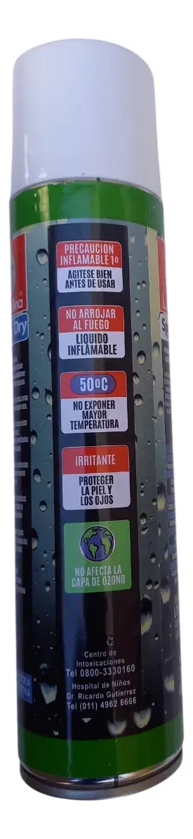 Extender la prenda o tela limpia y seca en la soga. Agitar el envase y rociar a 20 cm. con el aerosol siempre vertical. Dejar secar a la sombra 24 hs. Una vez seco no tiene ningún tipo de perfume u olor. Rinde de 2 a 4 m2 dependiendo de la absorción del material a tratar.