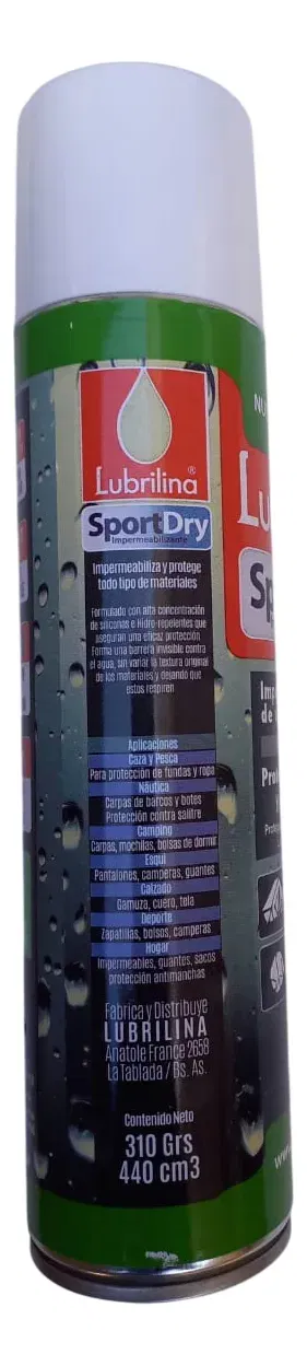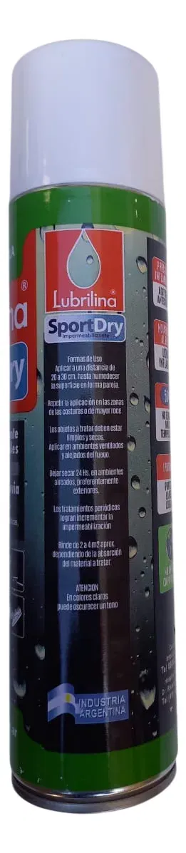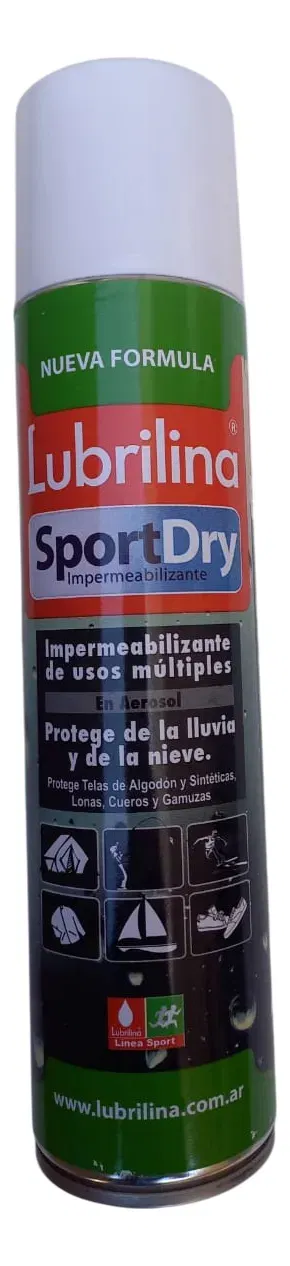 Lubrilina® SportDry. Aerosol Impermeabilizante para todo tipo de telas de algodón, sintéticos, cueros. Con alta concentración de hidro-repelentes que forman una barrera contra el agua. Para mochilas, camperas, sombreros, cubre-techos de carpas, parasoles, pantalones, carpas, tapizados, toldillas de embarcaciones, etc.