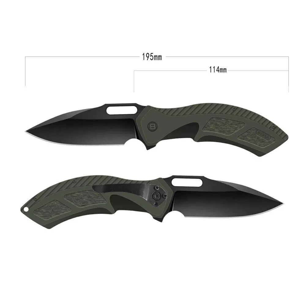Su hoja de acero 14C28N (**) con acabado BLACK TITANIUM PLATING, su apertura por rodamientos